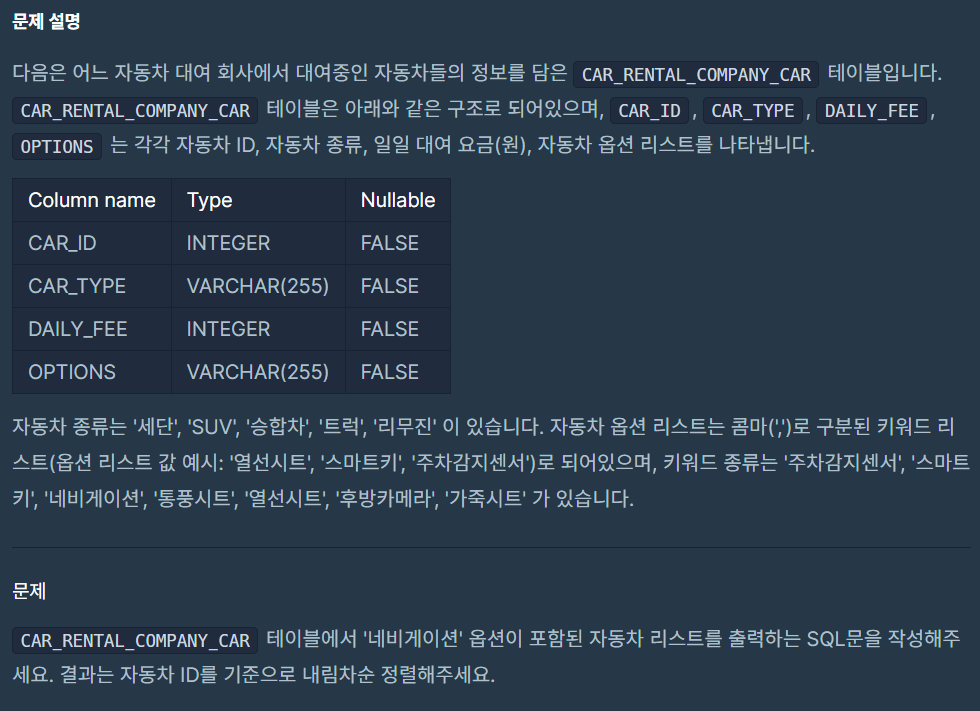 SELECT * FROM CAR_RENTAL_COMPANY_CAR WHERE OPTIONS LIKE '%네비게이션%' ORDER BY CAR_ID DESC;
