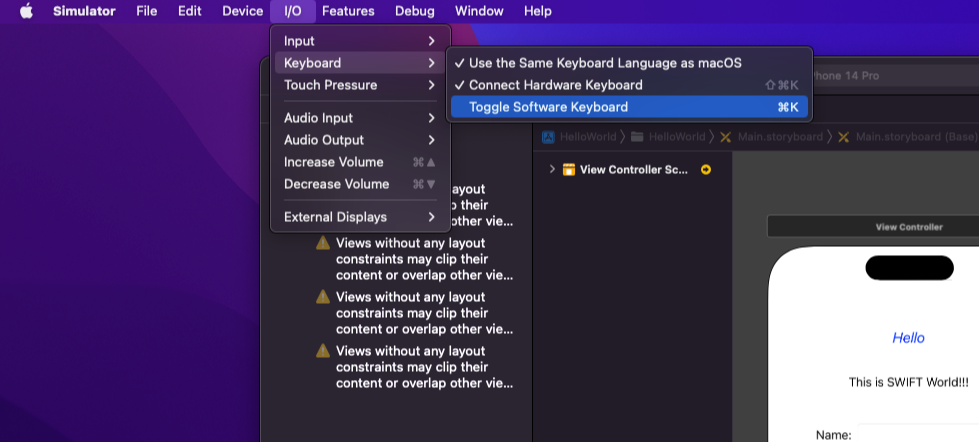 Simulator에서 toggle Software Keyboard를 선택하면 가상 키보드를 꺼냈다 집어넣었다 할 수 있다.