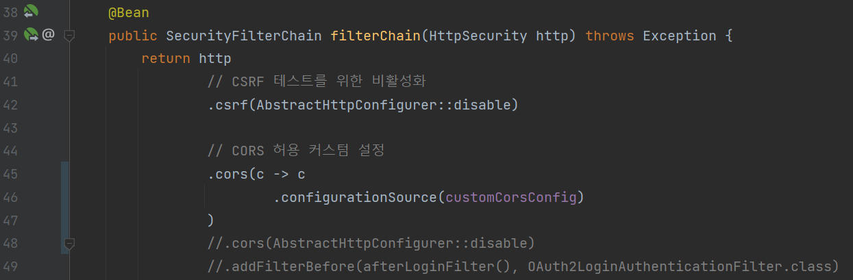 filterChain 설정에서 cors 설정 클래스를 적용시켜주면 된다.