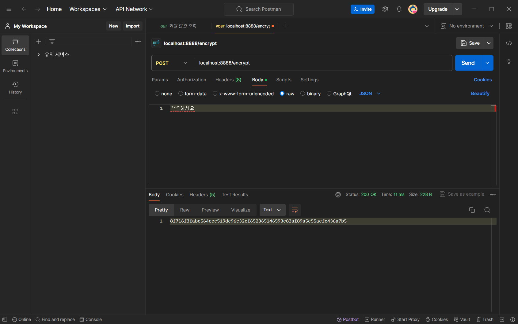 위 경로로 body에 원하는 값을 담아 요청을 보내면 응답으로 암호화된 결과를 얻을 수 있다.