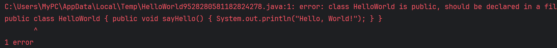 위와 같이 File.createTempFile()을 이용하면 위와 같은 임시 폴더 경로에 파일이 생성된다. 그런데 문제는 파일명과 public class로 설정한 클래스명이 다르다는 점이다. 이 문제 때문에 아래와 같은 무시무시한 빨간 글을 마주하게 된다.