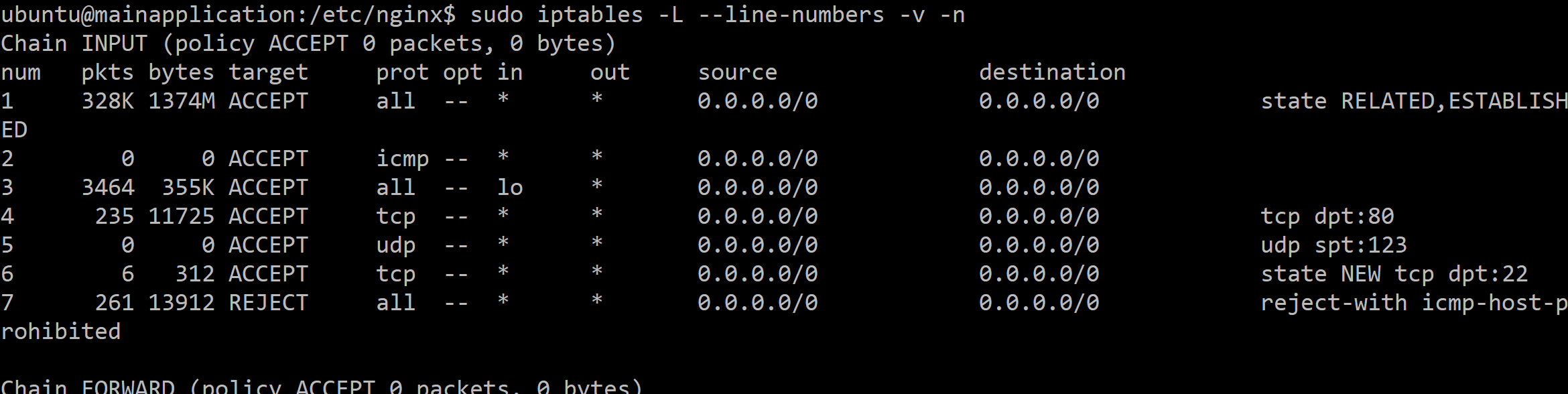 sudo iptables -L --line-numbers -v -n