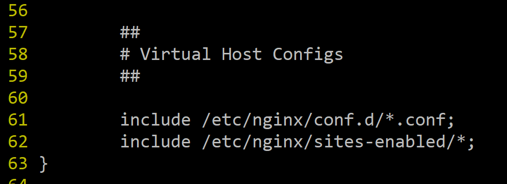 아래로 조금 내려보면 62행에 include로 작성된 행을 볼 수 있는데 여기서 위에서 설정한 파일을 포함시키는 것이다. 그래서 sites-enabled에 심볼릭 링크 파일을 만들어서 위 파일 내에 포함시키는 역할을 하는 것이다.