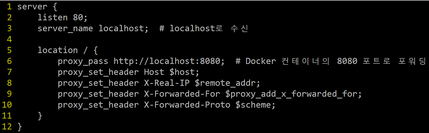 사실 원래 위 내용은 아니고 다른 내용이 있었는데 나는 80으로 오는 요청을 8080으로 포트포워딩하기 위해서 위와 같이 작성해주었다. server_name에는 도메인명을 작성하면 되는데 나는 현재 일단 도메인명은 없어서 localhost로 지정하였다.