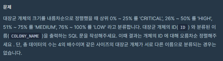 SELECT *, NTILE(4) OVER(ORDER BY SIZE_OF_COLONY DESC) AS PERCENT